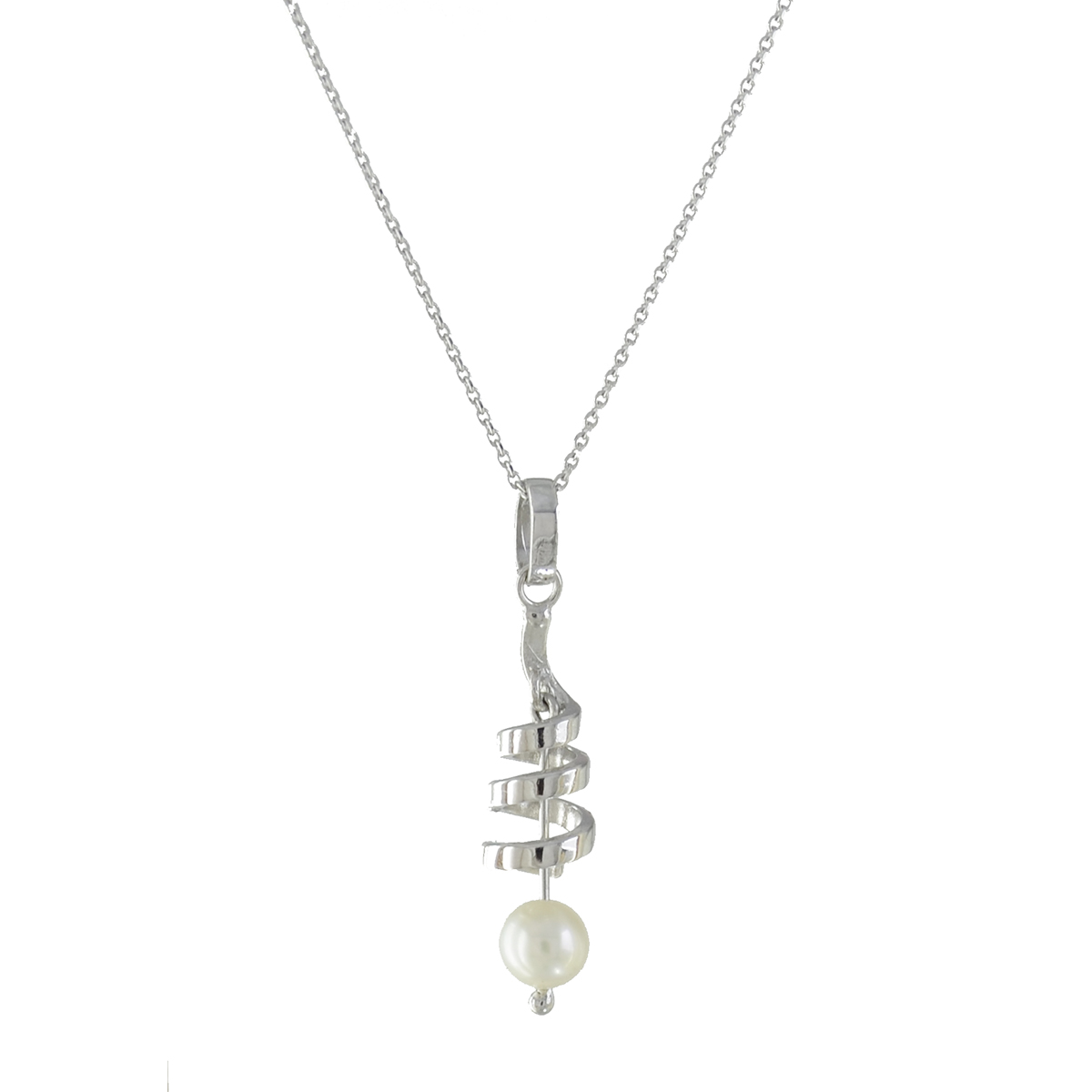 A cultured pearl Spiral-Pendant-Necklace – set into fourteen carat White Gold with a polished bale and 14ct white gold trace chain. Simple and delightful; a ‘wear-anywhere piece and a foolproof gift. Especially perfect for birthdays as pearl is the birthstone for the month of June.