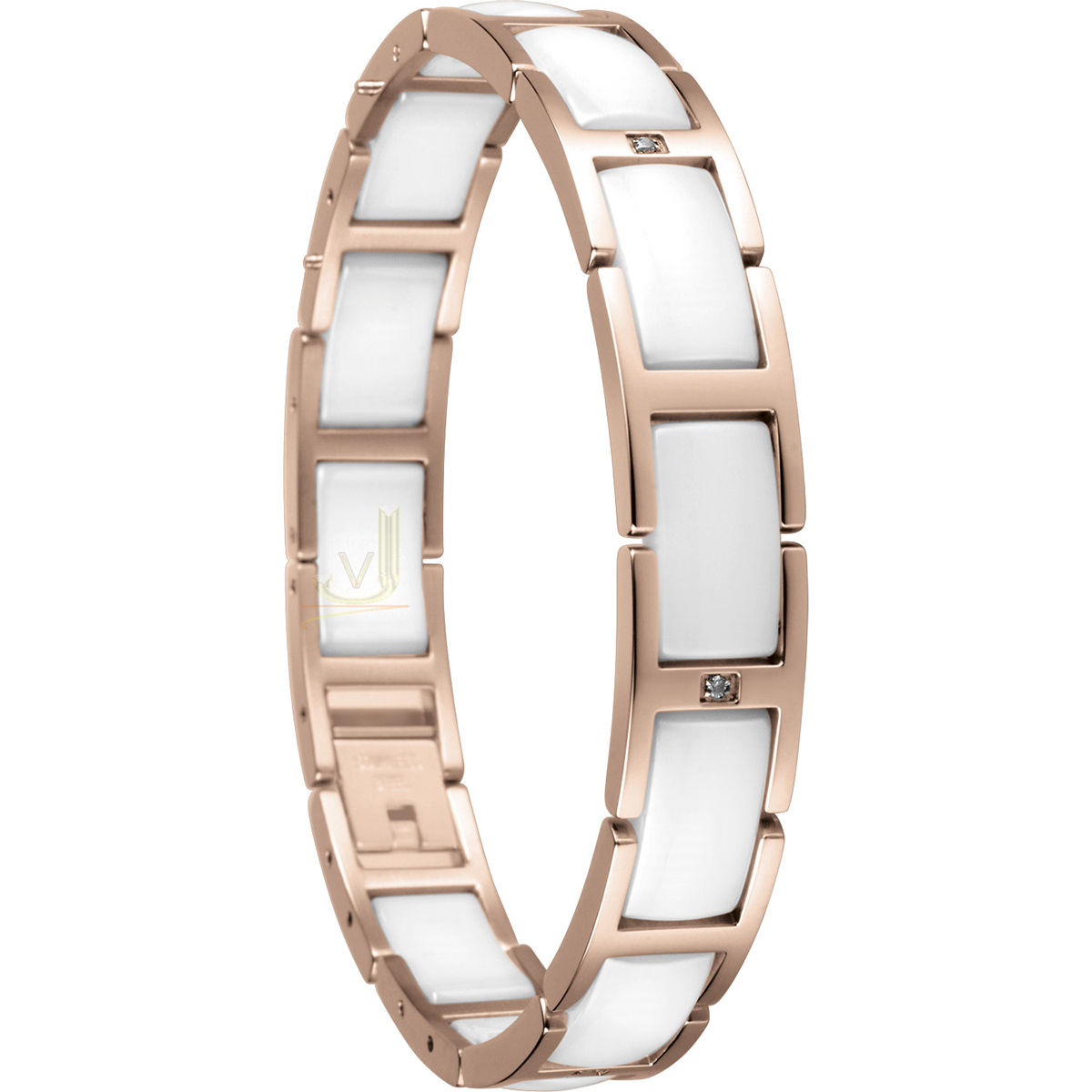 Stylish lady’s Time Link Collection features a sleek Rose Gold PVD stainless steel and bold White ceramic bracelet linked together to form a smooth curve.