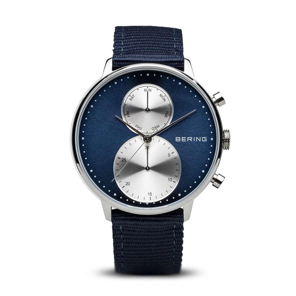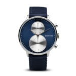 Classic Collection Bering Chronograph Gents Watch with Stainless Steel case, Sunray Blue and silver Subs, and Navy Blue Strap Gents Watch with Chronograph, Day and Date function plus sapphire glass