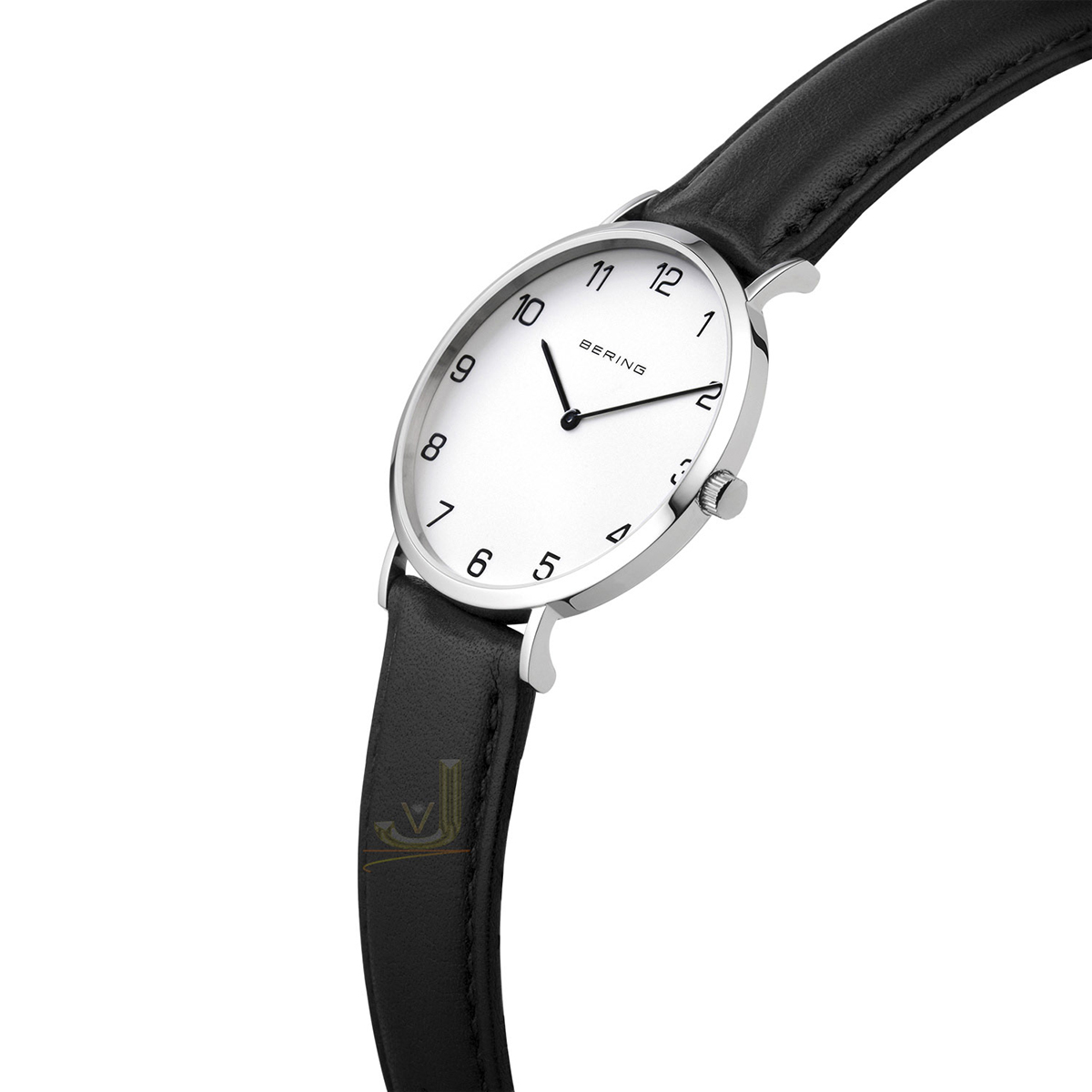 Bering Time Classic Gents Watch featuring round shape Ultra Slim Design polished Stainless steel case with a white dial on a genuine black Leather with a Sapphire crystal also 5 ATM Water Resistance