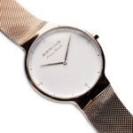 Featuring round shape IP Rose gold-tone Stainless Steel Case, White Dial with index hour indicators, IP rose gold-tone Milanese Stainless Steel bracelet, Sapphire crystal, powered by a quartz movement