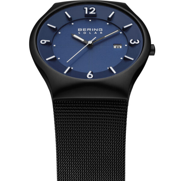 Slim Solar Bering Classic Gents Watch Featuring Black Brushed finish stainless steel case with sapphire crystal Blue dial with date and Milanese Black colour Stainless Steel Mesh