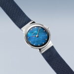 Bering Time Blue Ladies Watch featuring round shape Stainless Steel case with Blue Mother Of Pearl dial and Swarovski Crystal indicator on a IP Blue Milanese Stainless Steel Mesh bracelet and sapphire crystal