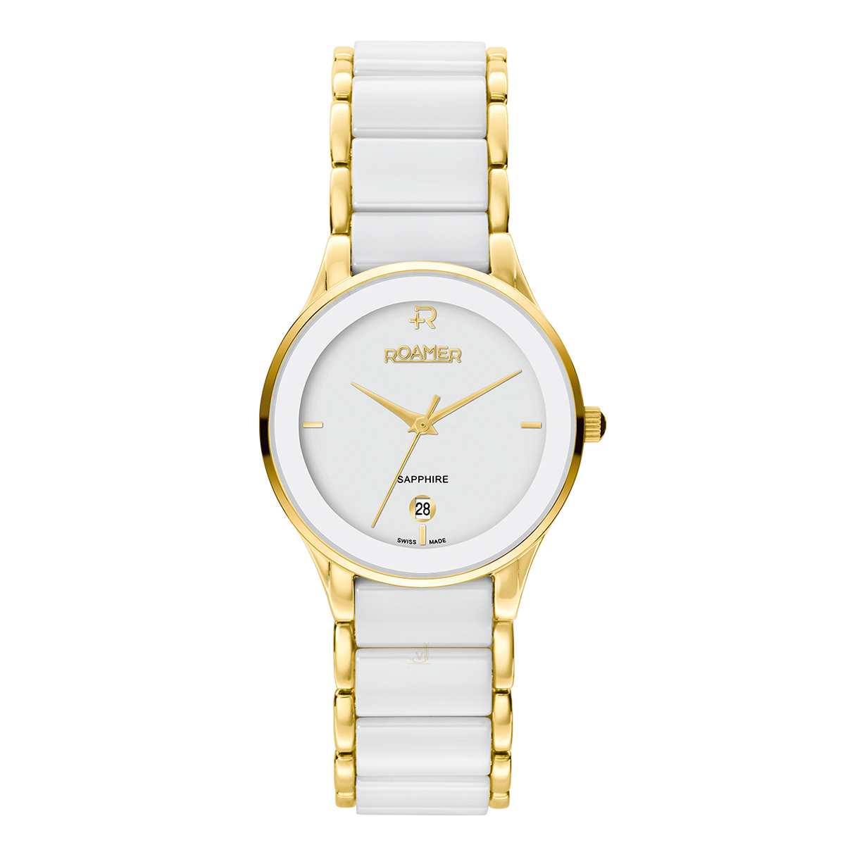 Roamer of Switzerland Classic Range Ladies watch featuring stainless steel case with date window a white dial and a two-tone bracelet with anti-reflection glass