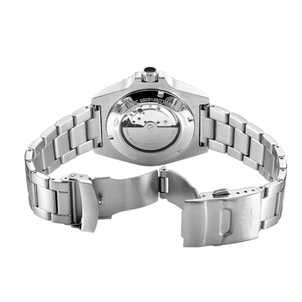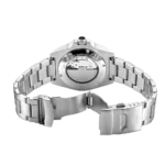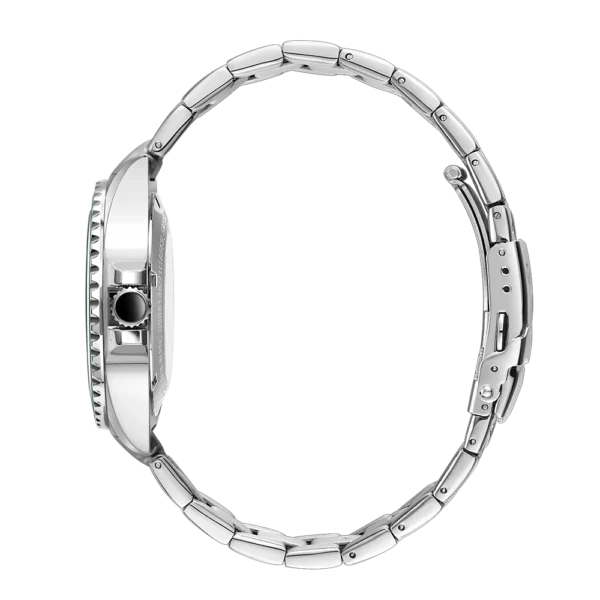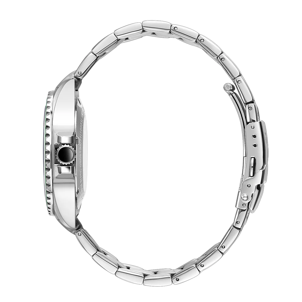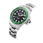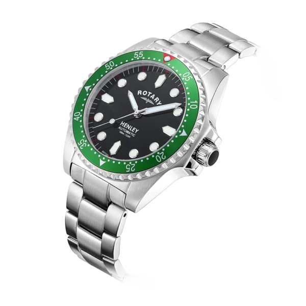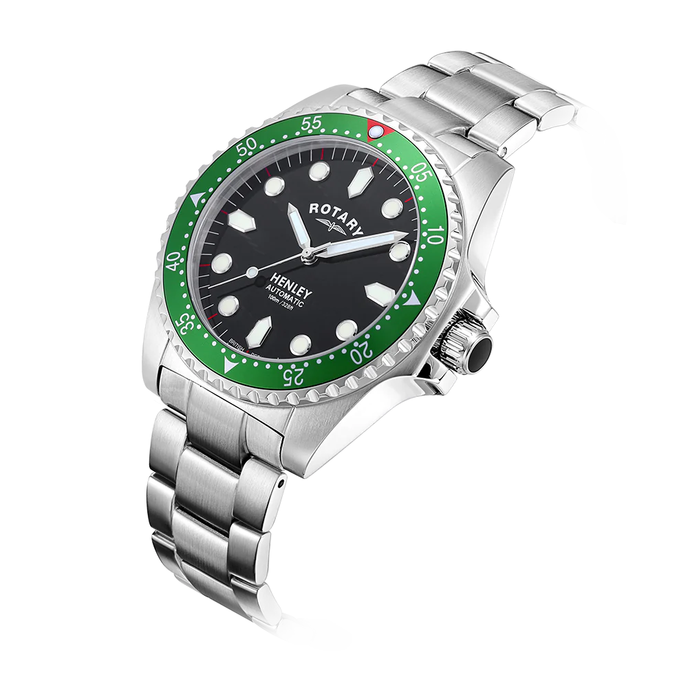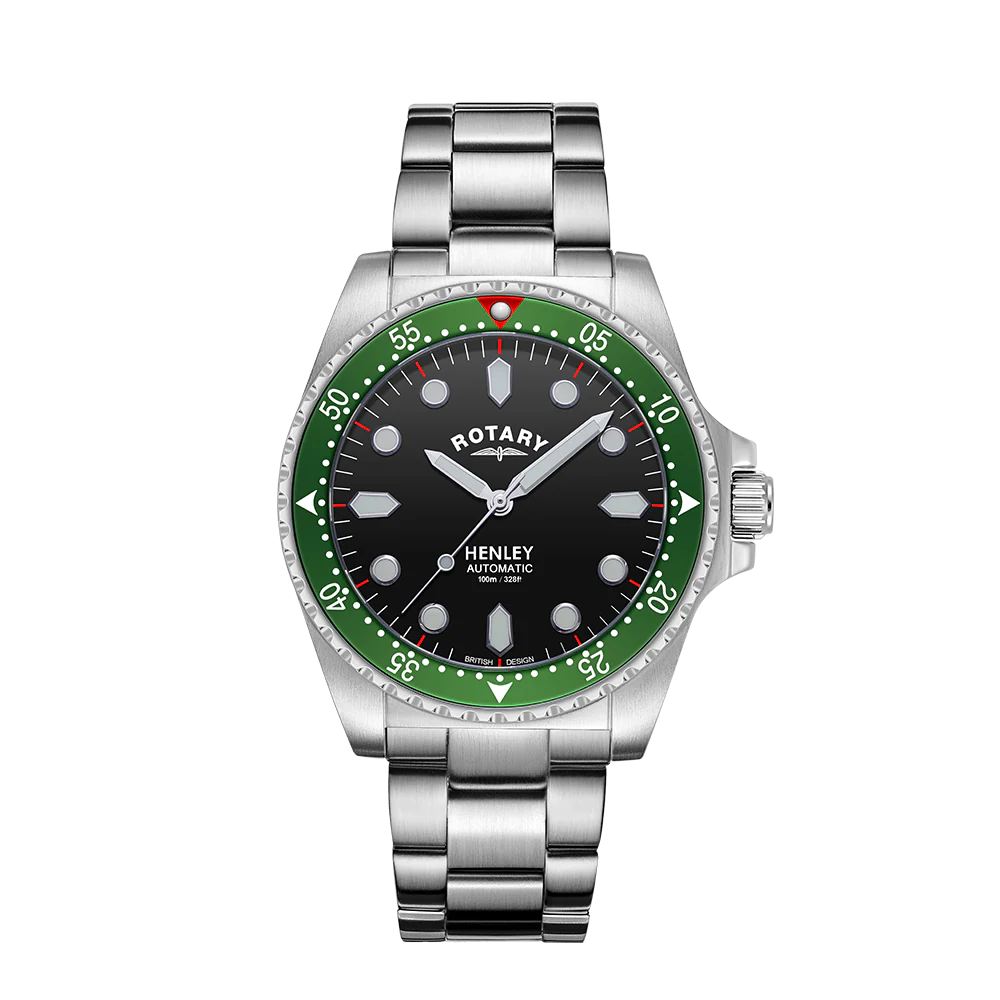 The ultimate dive watch in Rotary’s portfolio, this Henley is an elegant partnership of high-quality function and sporty elegance. Water-resistant up to an impressive 200m, the timepiece is crafted with a sturdy 41mm Stainless Steel case and sapphire glass that protects its black dial. Large luminous hour markers and hands make for optimal visibility in darker environments, used in conjunction with the red luminous diver’s dot on the unidirectional green bezel. Perfect for those who are often on the move, the watch is powered by an automatic Miyota 8215 movement. Made in stainless steel, the 3 link bracelet complements the protruding crown which helps elevate the contemporary aesthetic of the Henley.