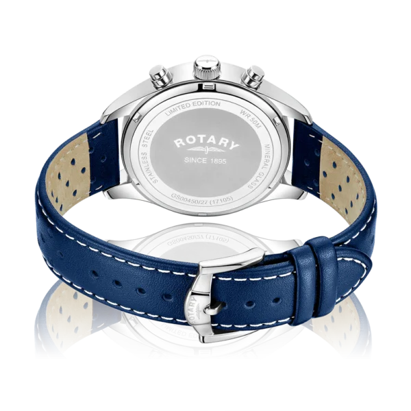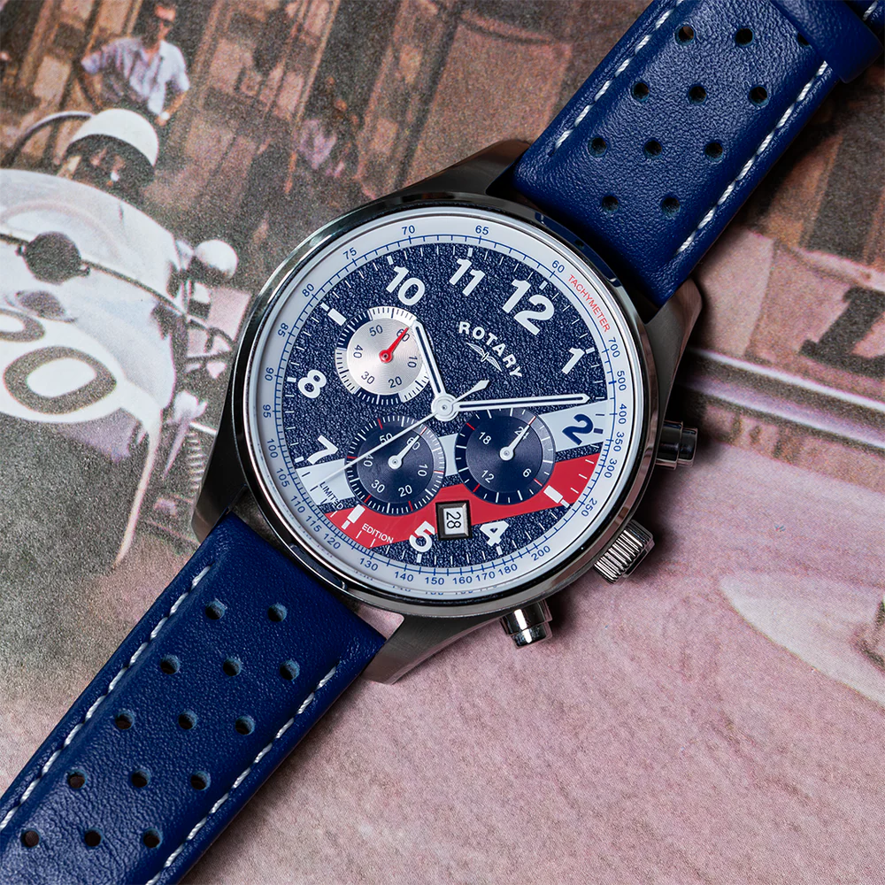This limited edition watch is crafted with a robust 42mm stainless steel case, housing a 3-dial Japanese quartz chronograph complication on a deep blue textured dial. Its vibrant red, blue, and white sub-dials add a playful yet sophisticated touch, with a distinctive red second-hand sub-dial for timekeeping precision. Perfectly balancing functionality with style, the “Cooler” edition is water-resistant up to 50 meters, ensuring reliability for everyday wear. The numbered Rotary case-back ensures that each watch is one of a kind. Adding to its racing-inspired aesthetic, the watch is paired with a perforated blue leather strap, echoing the look of classic racing gear. Each watch is individually numbered on the case-back, underscoring its exclusivity, with only 200 pieces available exclusively at Rotary stockists.