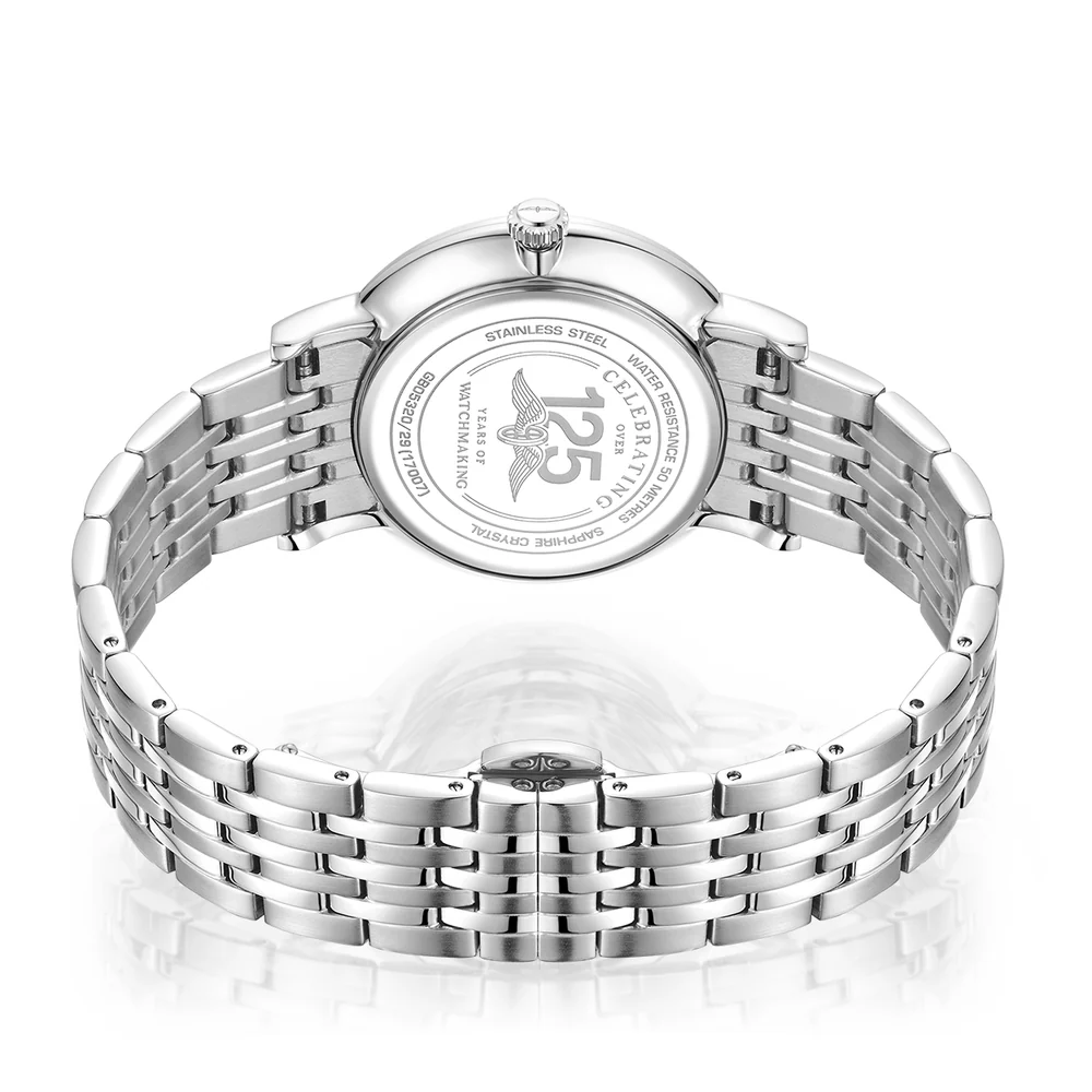 Water-resistant up to 50m, this classic timepiece is powered by a reliable quartz movement. The running second hand at 6 o’clock adds a practical touch to the watch, making it not only a stylish accessory but also a functional companion for everyday wear. The multi finish stainless steel bracelet ensures that the watch stands out.