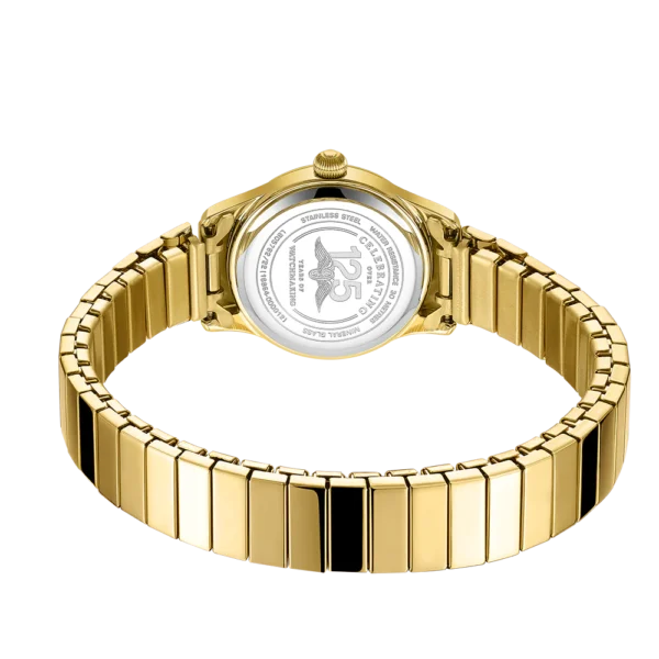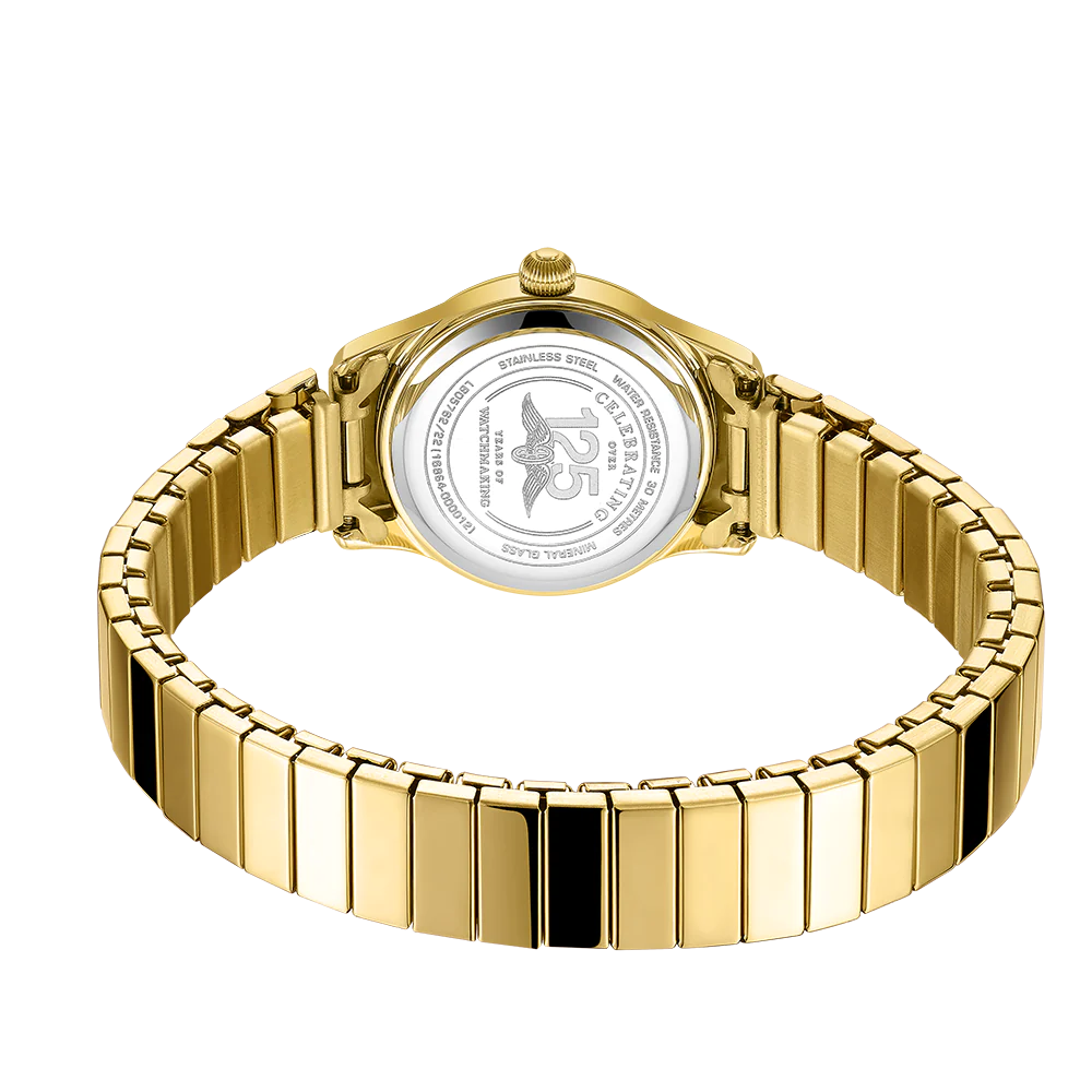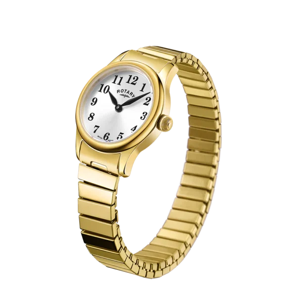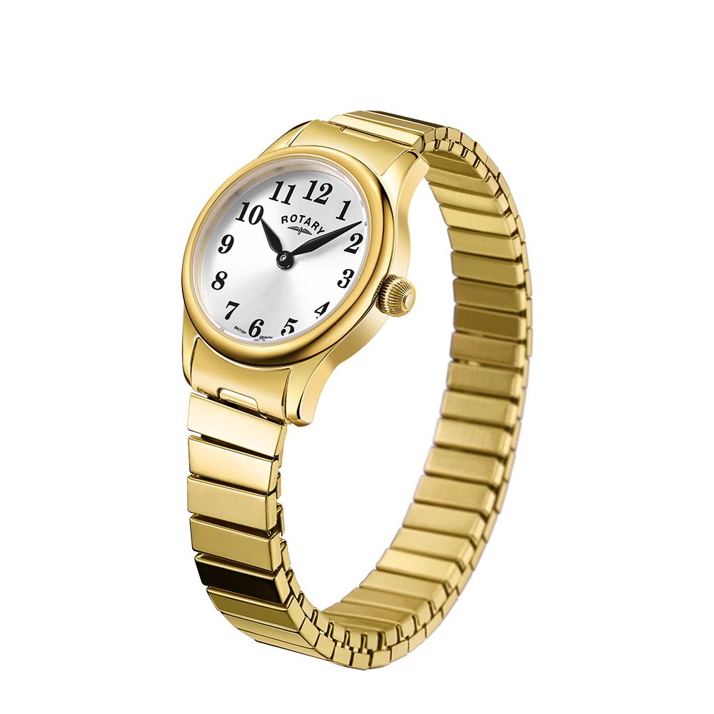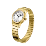 This Expander is built with comfort and ease in mind. The bracelet fits any wrist size and requires no adjusting. The 24mm gold case features a minimal, silver sunray dial with arabic numerals This model is powered by a quartz movement and is water-resistant up to 30m.