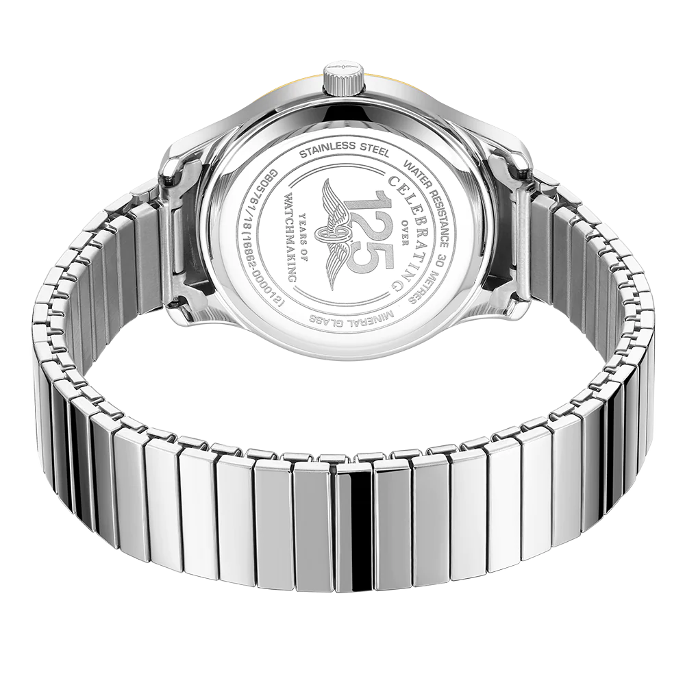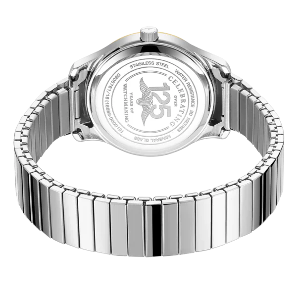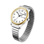 This Expander is built with comfort and ease in mind. The bracelet fits any wrist size and requires no adjusting. The 38mm stainless steel case with gold PVD bezel features a minimal, clear white dial with arabic numerals and day/date window at 3 o’clock. This model is powered by a quartz movement and is water-resistant up to 30m.