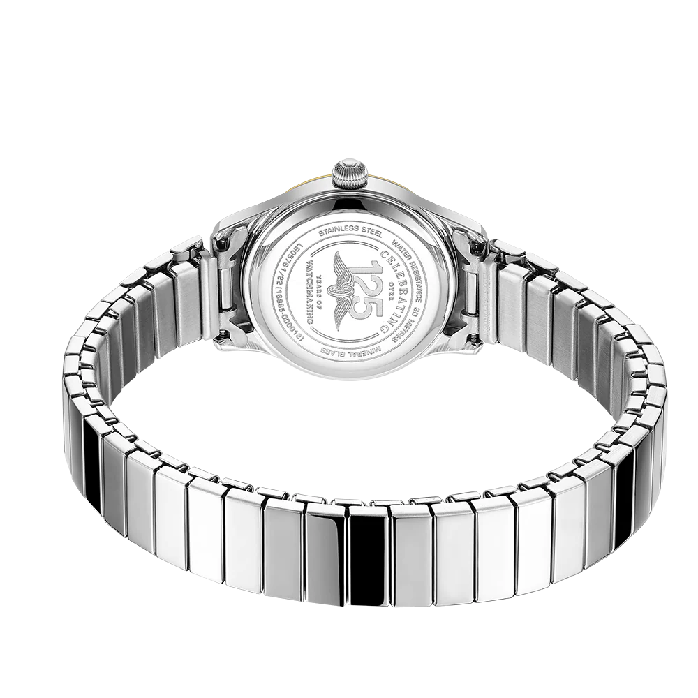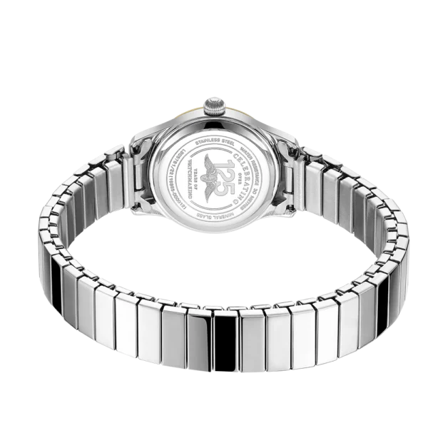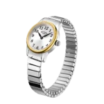 Ladies subtle Gold PVD and Stainless Steel expanding bracelet watch with quartz movement and a Silver dial set beneath the mineral glass.