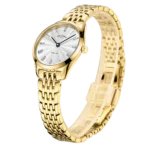 This stunning watch from the Ultra Slim collection features a silver-white dial with striking Roman numeral markers. The Gold PVD Stainless Steel base and bracelet make for a pop of colour underneath the cuff. Built with sapphire glass and powered by quartz, the watch is a durable display of craftsmanship.