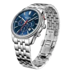 This Monaco watch features a blue dial with pencil hands, is powered by a Miyota quartz movement, and also features a distinctive 2-layer dial to accommodate the chronograph function within a 42mm Stainless Steel case. It neatly accommodates a date window and has a Stainless Steel 5-link bracelet. It is Water Resistant to 50m.