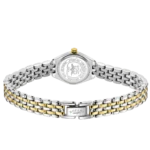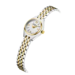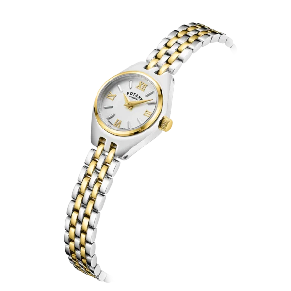 This Rotary Traditional is a delicate ladies cocktail watch. It has a case size of just 20mm and a stunning white dial with elegant Gold applied roman numerals and hands, encased within scratch resistant sapphire glass. The two-tone Gold PVD Stainless Steel 5 link bracelet is secured with a hidden butterfly clasp. This model is water resistant up to 30m.