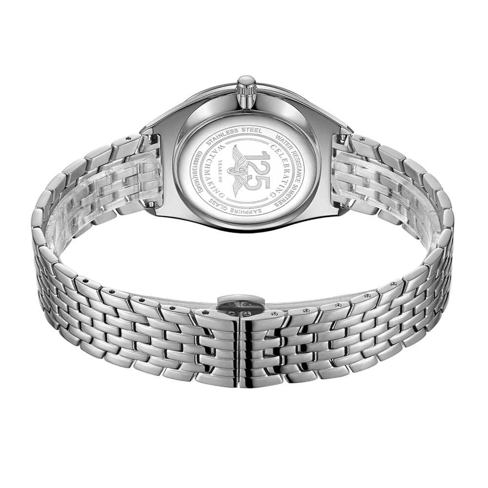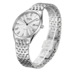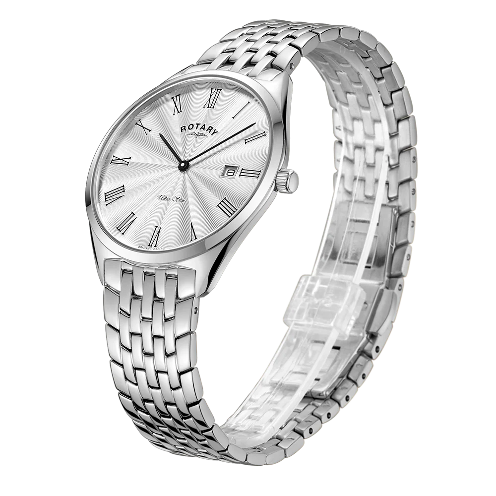 Looking for a classic timepiece that blends subtle design with striking features? The Ultra Slim family exudes sleek sophistication with a case profile of just 5.7mm, making this watch range unparalleled in comfort and the perfect timepiece to slip under a shirt cuff. Each beautifully refined timepiece is designed to complement and enhance any festivity and activity. This Ultra-Slim timepiece features a sliver white dial with traditional black Roman numeral markers, a 38mm diameter case, and is water-resistant to 50m. It is powered by a quartz movement and has a Stainless Steel 7 link bracelet secured with a deployment clasp.