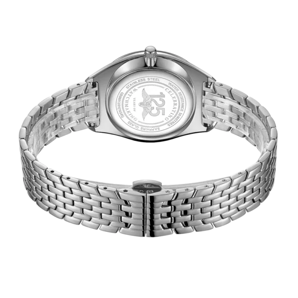 Designed for discretion, this Ultra Slim watch is crafted with Stainless Steel, and sapphire glass and is water-resistant to 50m, making it both sturdy and handsome. Powered by a quartz movement, the timepiece’s 38mm silver dial elegantly features Roman numeral markers.