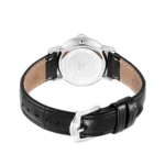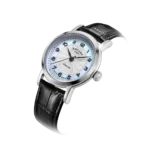 Crafted with a stainless steel 27mm case, black leather strap, as well as strong sapphire glass, this beautiful Windsor timepiece features black Arabic numeral indices over a white mother of pearl dial. Water resistant to 100m, this classic watch is powered by quartz and displays a date window.