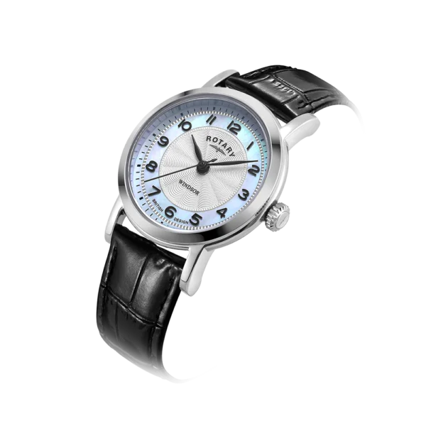 This Rotary Ladies watch is an Elegant stylish watch. This Windsor features Miyota quartz movements with a stunning mother of pearl plus silver sunray dial. This watch has a Stainless Steel case and leather strap. This watch is Water Resistant to 100 meter so you can swim and dive all day.