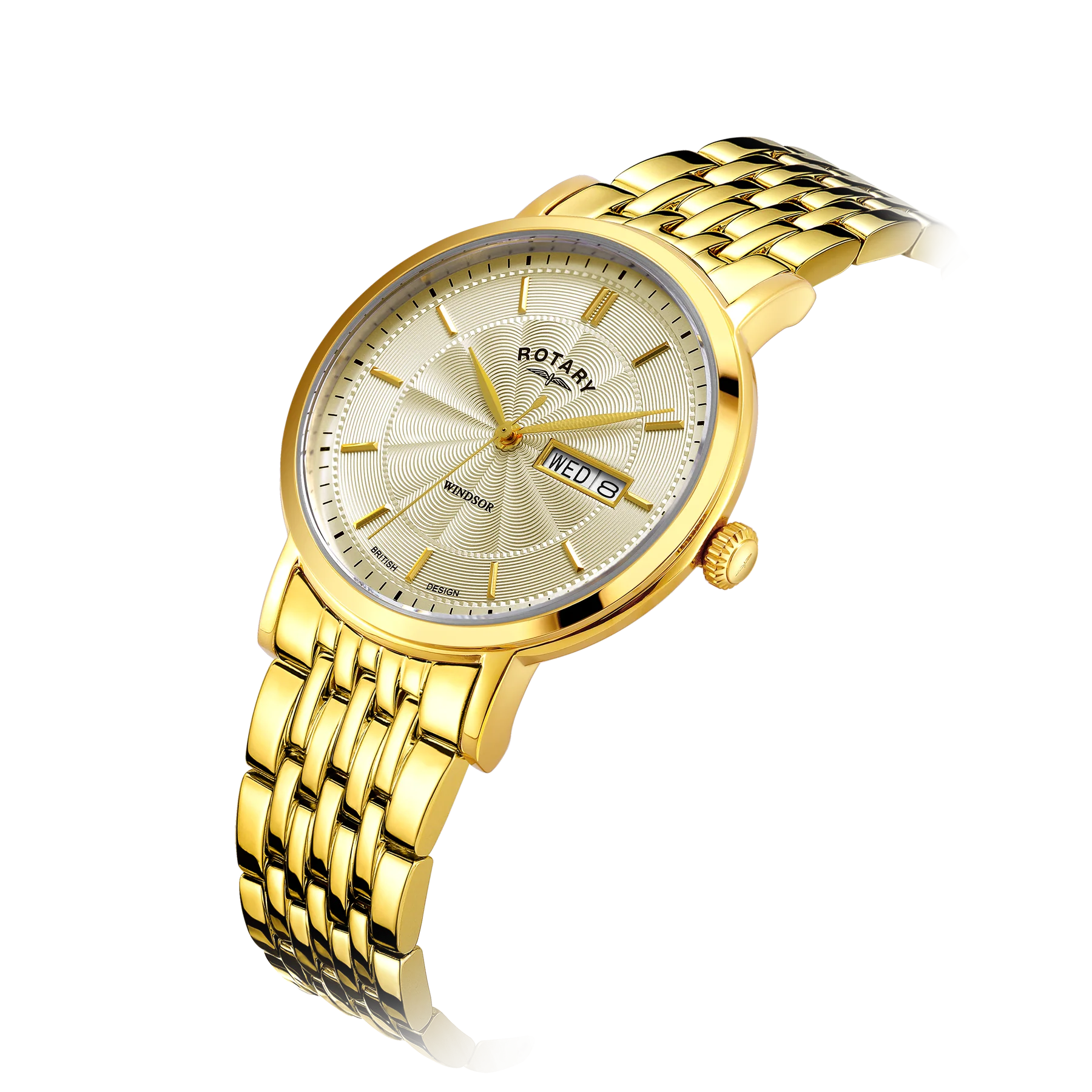 Crafted with a gold PVD stainless steel bracelet and 37mm case, as well as strong sapphire glass, this traditional Windsor timepiece features applied indices over a champagne guilloche dial. Water resistant to 100m, this classic watch is powered by quartz and displays a day/date window.
