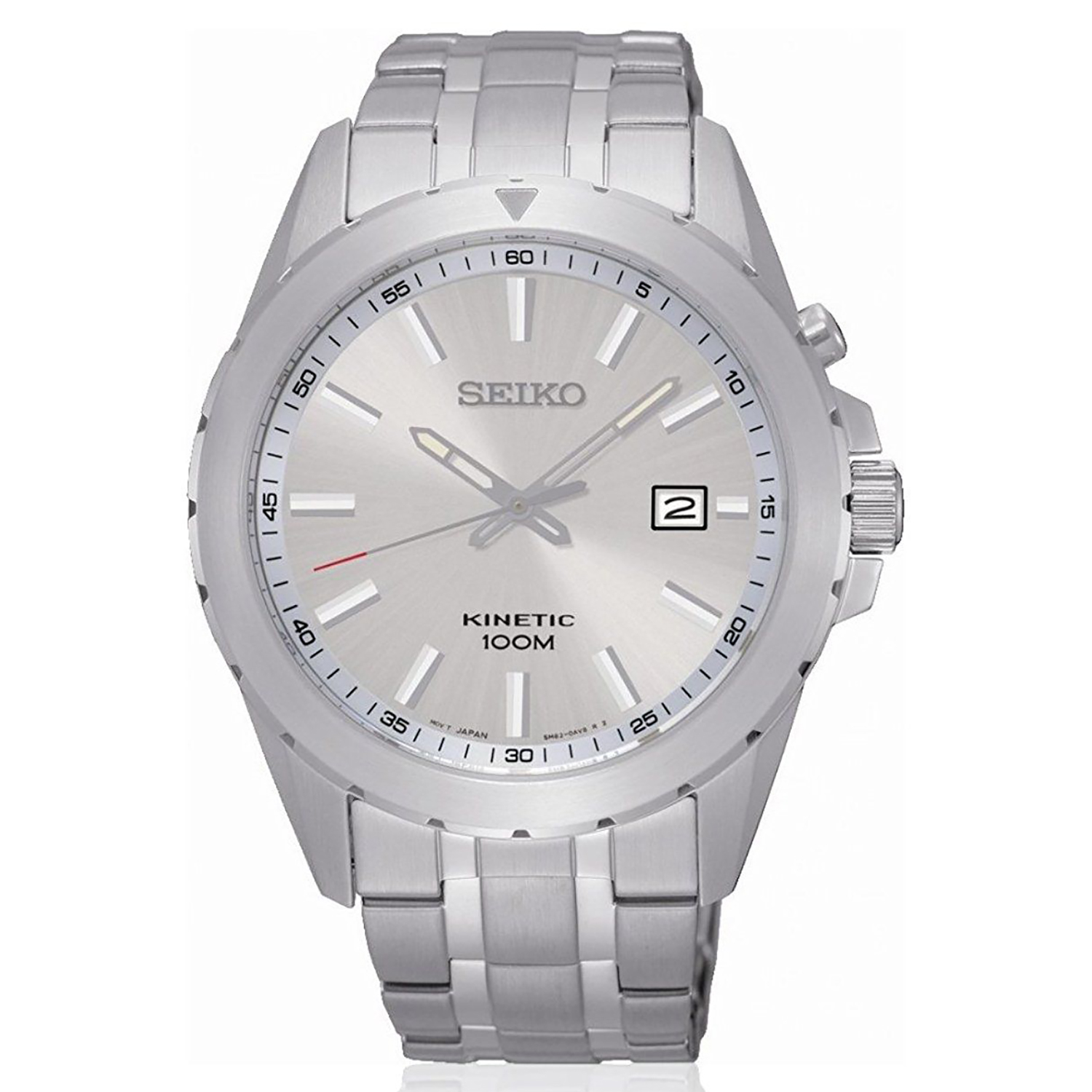 Seiko-kinetic 100m-WR-Gents Watch featuring Stainless steel case with see-through back, silver dial, Stainless steel with fold clasp with push-button clasp bracelet, and Hardlex Crystal