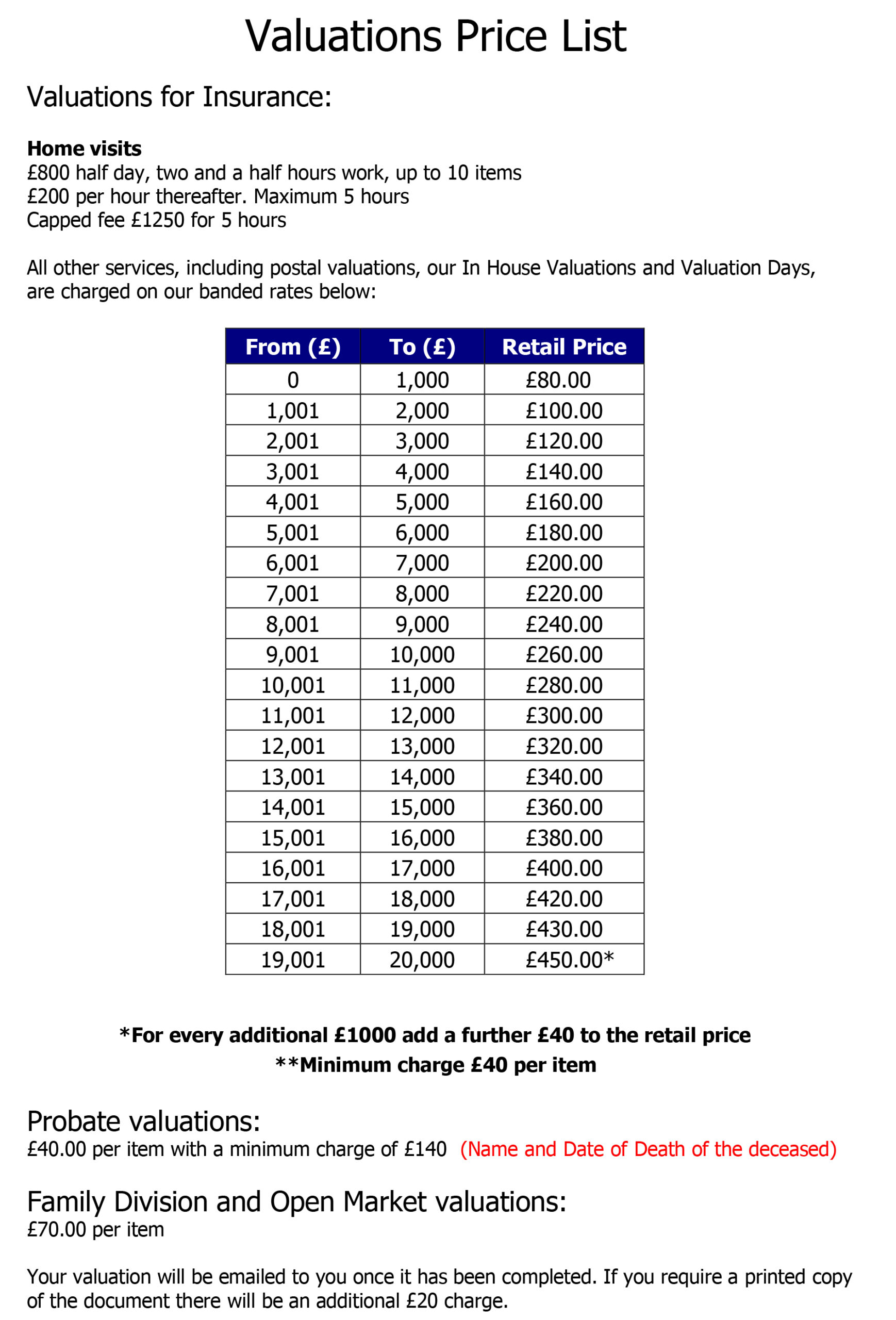 All other services, including postal valuations, our In House Valuations and Valuation Days, are charged on our banded rates below: